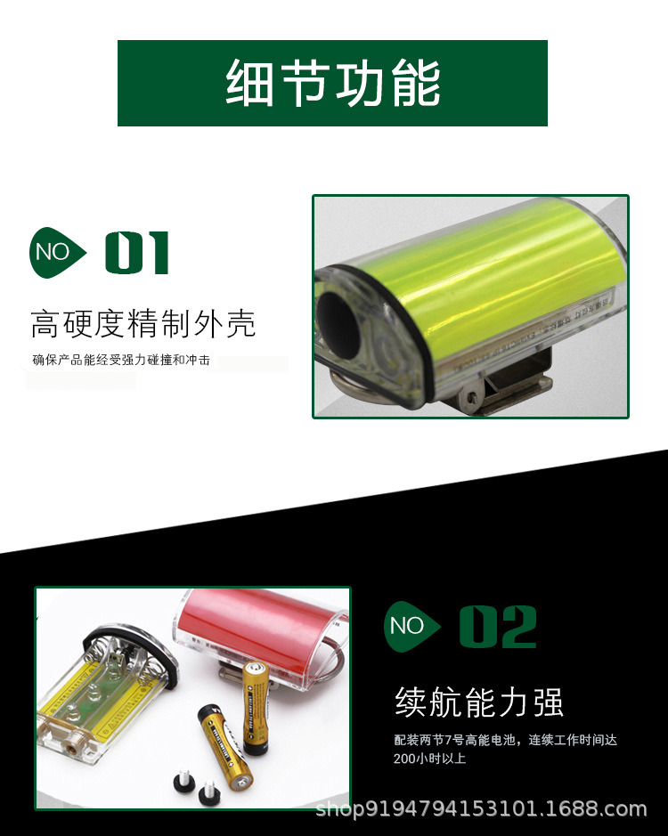● 高效节能:采用LED光源,光效高、显色性高。配装两节7号高能电池,连续工作可达80小时以上。