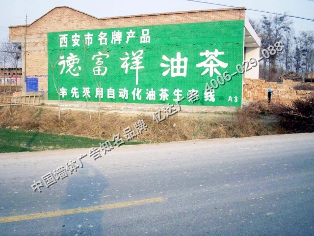陕西亿达墙体广告公司主营范围:陕西墙体广告、西安墙体广告,铜川墙体广告、宝鸡墙体广告、咸阳墙体广告、渭南墙体广告、延安墙体广告、汉中墙体广告、榆林墙体广告、安康墙体广告、商洛墙体广告等地区。