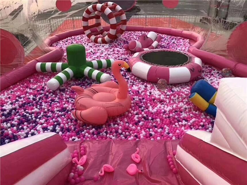 再经过精心的安顿.还可以摆放一些休闲桌椅供游客们休憩.当然了.这些都是不太首要的.首要的是这儿面有可供游客们玩耍的.深受游客们喜欢的由各种外型的充气滑梯所构成的百万海洋球池.在海洋球池中承载着百万个海洋球.海洋球色彩有多种