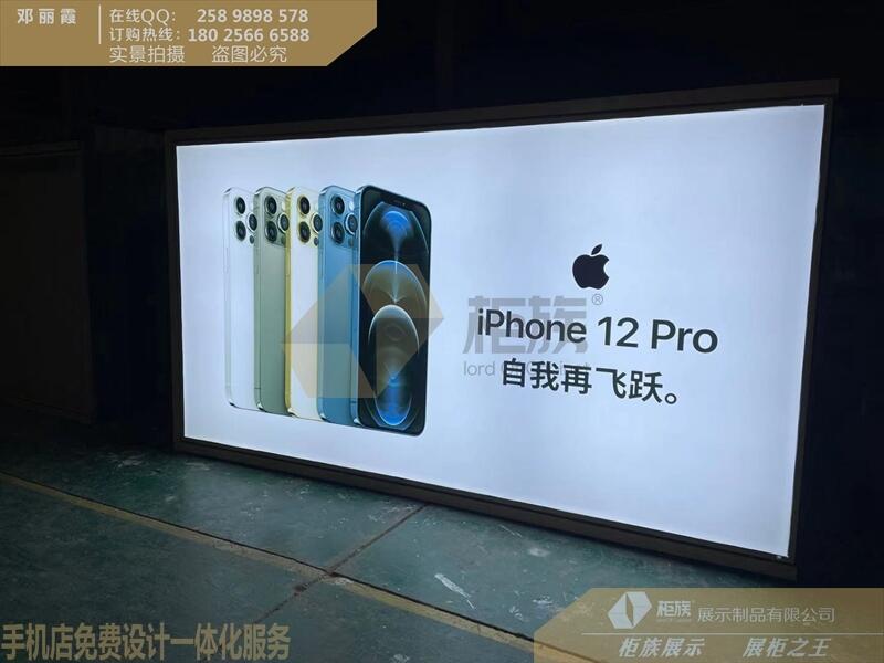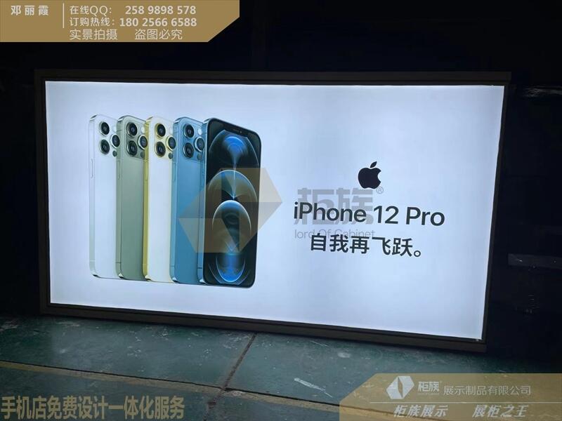 苹果13手机体验店新款配件柜,靠墙款式,台面可展示手机或平板等产品,尺寸可根据现场定制,免费设计店铺平面图效果图,专业给与您开店指导建议苹果卡墙式灯箱,画面可更换,一般卡入墙体的配件柜和灯箱高度是1.8米,而长度是根据实体店内尺寸定制,现场装修只要预留要尺寸,厂家便可根据尺寸确定需要制作的长度,展示柜尺寸的定制是为了跟完善贴合店内需要来制作,达到事半功倍的效果