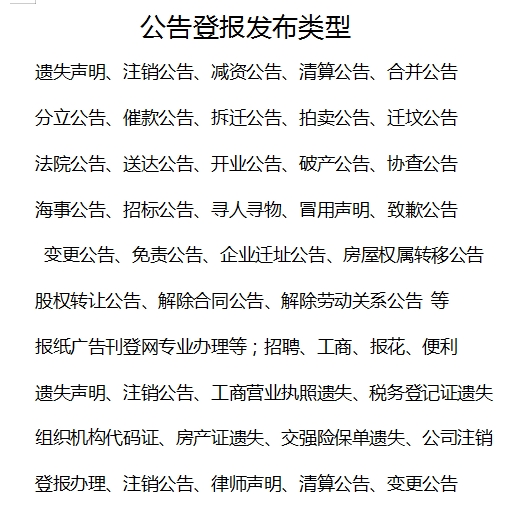 专业办理.统一价格,统一格式.本市登报,各地区公司及个人各种证、遗失声明、申明、登报挂失、公司注销公告、工商减资公告、清算公告、歇业公告、变更公告、讣告,公司声明等。