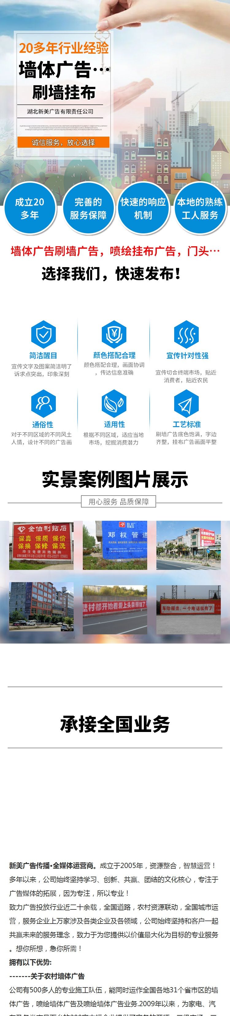 不断优化发布手段,形成了我们的优势媒体框架,我们结合广告产品需求,进行数据分析,锁定受众群体,确保媒体的传播更为准确有效。下乡刷墙这种推广方式在很多行业都比较常见了,以前比较多见的是移动、联通、电信之类的电信运营商;种子、化肥、农药类农资产品;,成就了我们可以在随时承接任何大企业全国范围的广告发布。