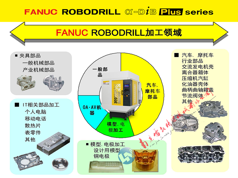 客户群体:汽车部件、精密钟表、医疗器械、家电、IT电脑数码、通讯器材、智能手机、智能平板电脑、铜公加工、4轴高速加工、摄像器材、精密模具、电脑硬盘、汽车发动机缸盖、转向机、涡轮、汽车空调部件、摩托车发动机零部件等都是发那科擅长的加工领域。均大量采用发那科的小型加工中心来完成。
