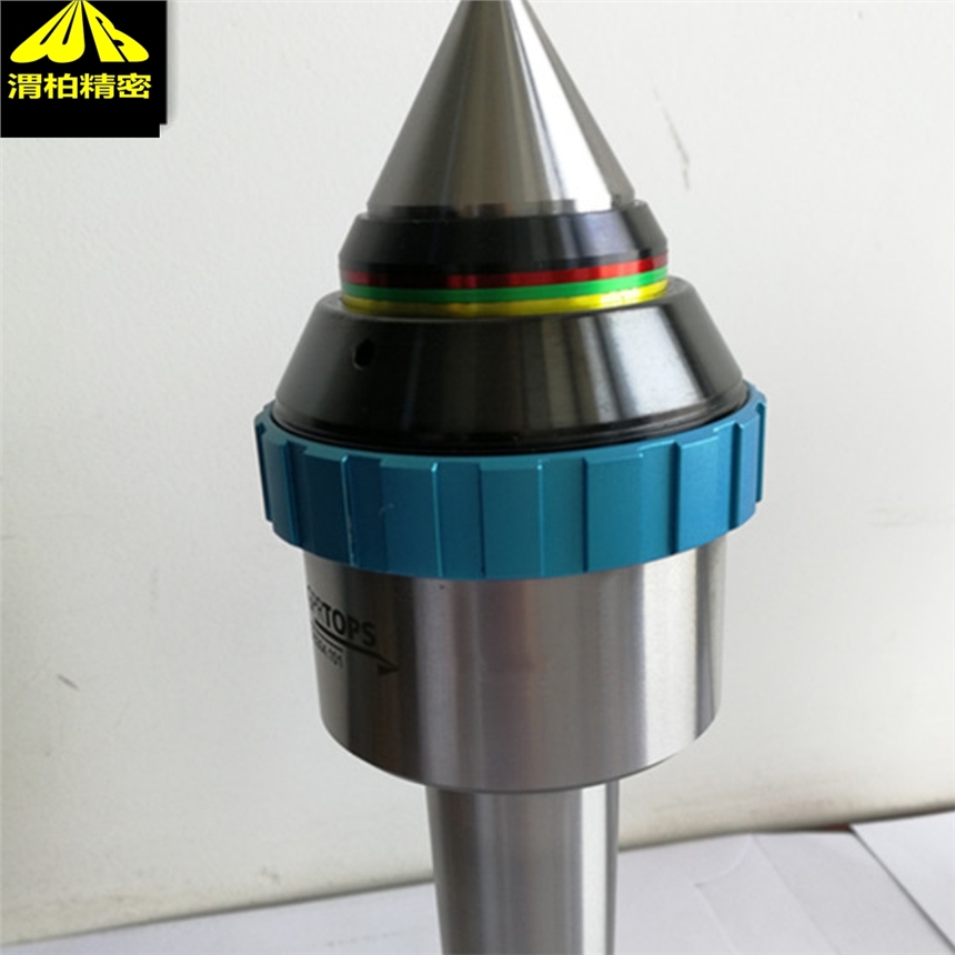 5.GPRTOPS弹性顶尖:Gprtops弹性顶尖,带有红、绿、黄3种颜色的压力指示环,分别表示轴向压力过大,适中,偏小三个状态,方便压力调整和监视切削力状态,同时亦可配合驱动顶尖进行外圆长行程车削。弹性顶尖GPRTOPS顶尖的伸缩性,既保证顶尖与工件中心孔良好接触而使工件径向定位,又可以使工件端面与梅花锥套端面齿密切接触,借以达到工件轴向定位和夹紧。同时工件端面在一定压力下与梅花锥套端面齿的接触,能够传递动力。如果能够配合尾顶尖快进机构一起使用,还可以在不停车条件下快速装卸工件。这样弹性顶尖适宜粗、半精车小型轴类工件。因其结构简单易造,操作方便,效率高,在中小批生产中尤为常见。