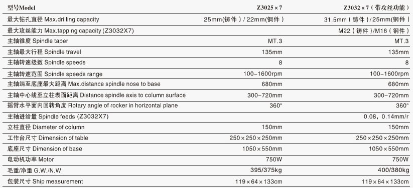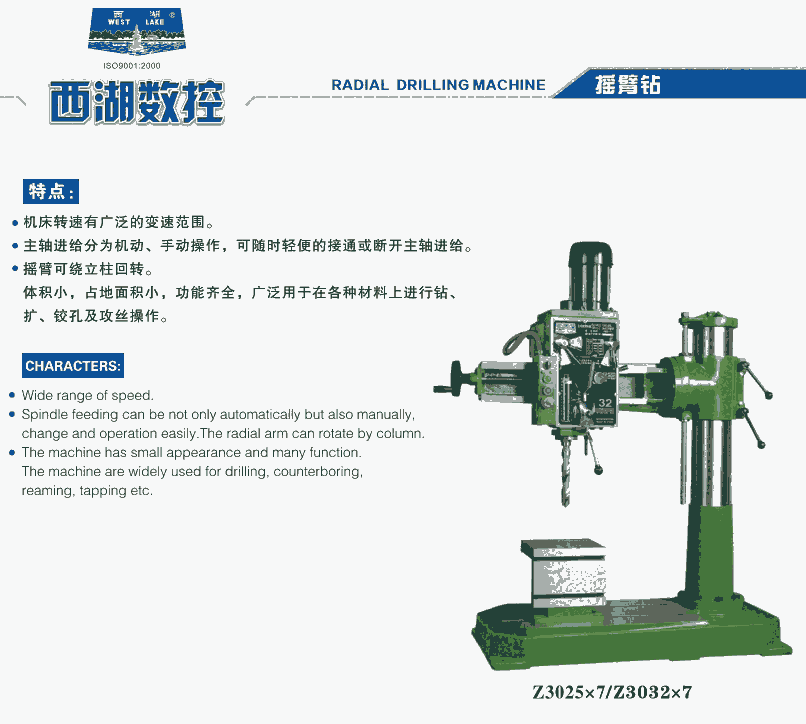 杭州西湖台钻产摇臂钻床型号有:Z3025×7 Z3032×7 Z3032×9 Z3040×12