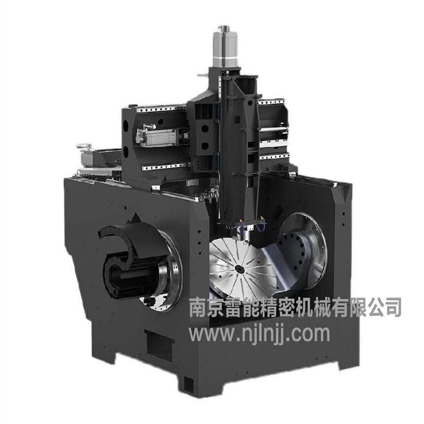 数控回转摆动工作台实现双壁支撑,Y轴采用四导轨支撑和位于中心的主驱动,A轴摆动角度为-130°~ +130°。环形刀库与机床床身融为一体,结构简单、节省空间。