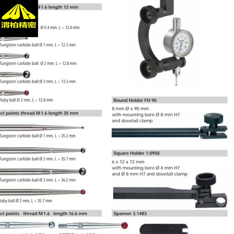 标准配置包括:1个钨钢球接触点,直径2毫米;1个直径为1/4的杆;1个用于更换接触点的扳手。