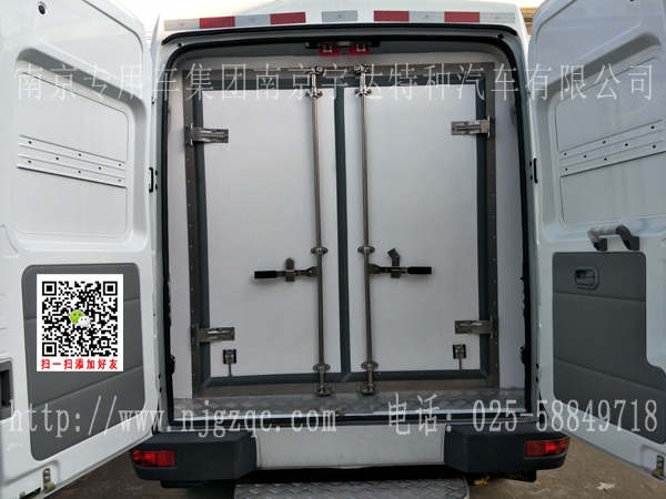3、双层后门,门框材料为2.5mm不锈钢,采用橡胶条密封,保证厢体的气密性,后门开启机构均为不锈钢件;