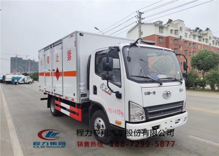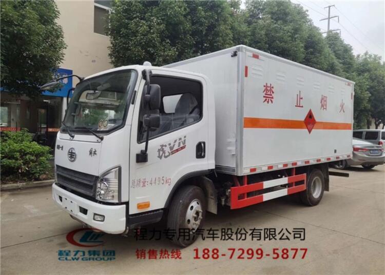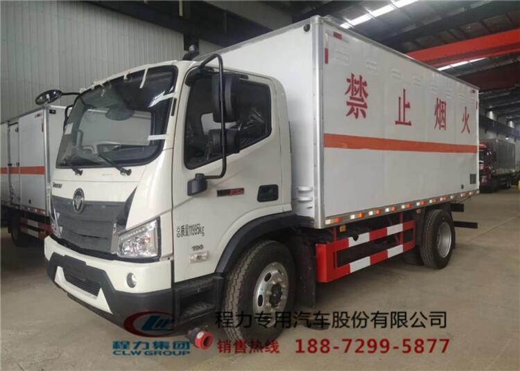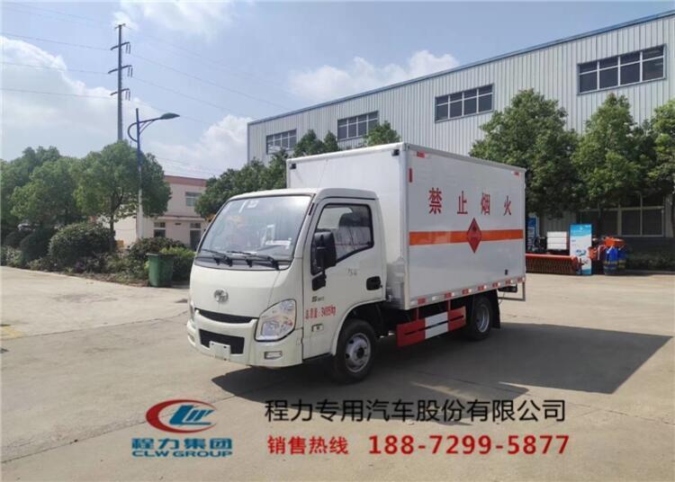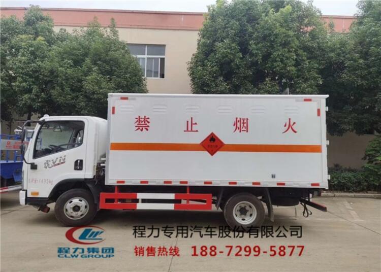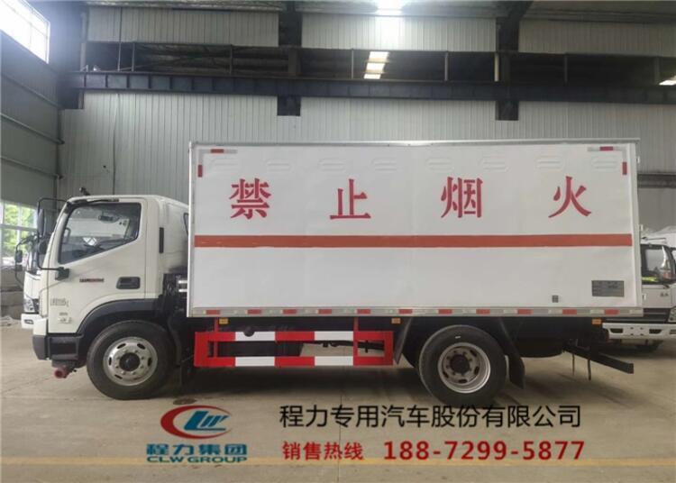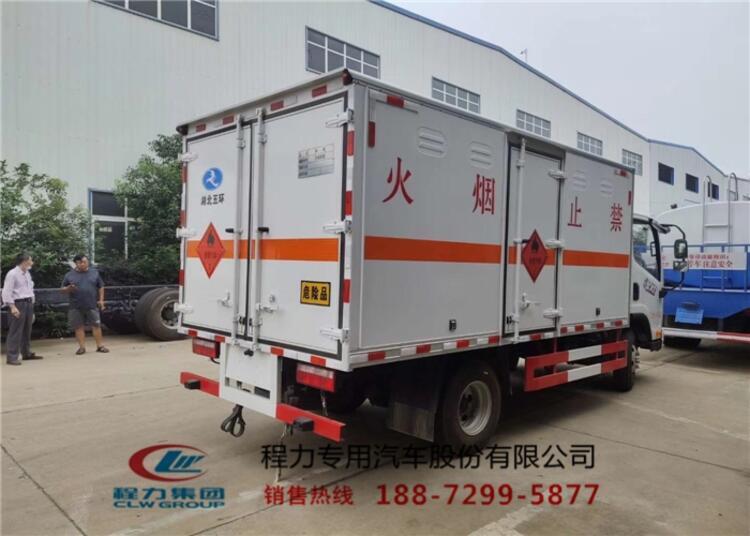 上装配置:严格按照公告尺寸制作,外板采用1mm厚冷轧板有一次性成型的百叶窗,内饰为导电性能良好的铝板有透气孔,内衬为矩形管骨架牢靠稳定,内部填充为透气防潮阻燃的挤塑板,四种材料经现代工艺复合而成,厢体外部上下铝合金型材包边,底板和车厢前下部铺橡胶皮,后门双开,右侧中部单开门,车辆外部有静电带、灭火器、防火罩,车厢内安装烟雾报警器和门防盗报警器,严格按照危险品相关法规张贴。