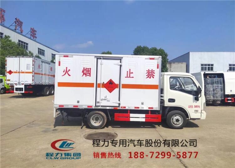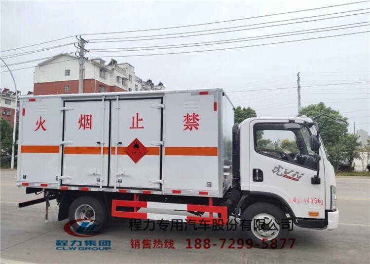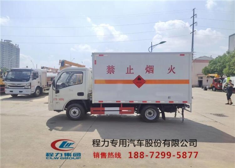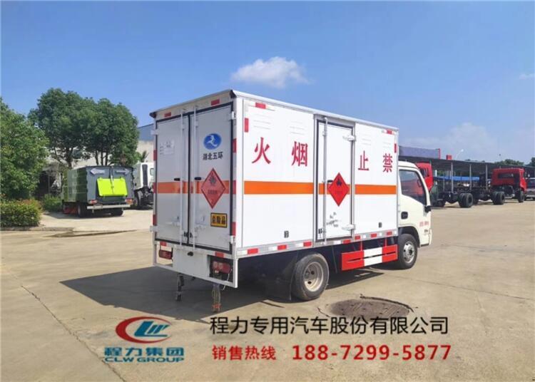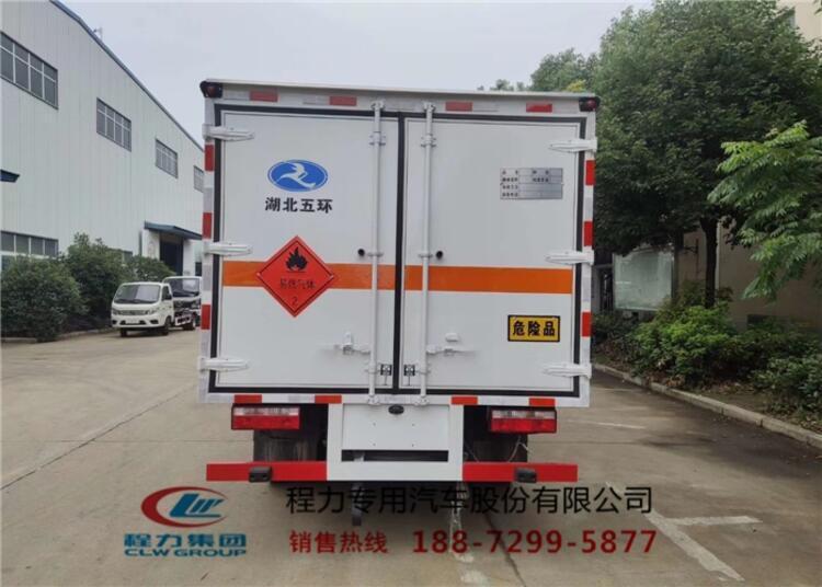 厢体配置:严格按照公告尺寸制作,外板采用1mm厚冷轧板有一次性成型的百叶窗,内饰为导电性能良好的铝板有透气孔,内衬为矩形管骨架牢靠稳定,内部填充为透气防潮阻燃的挤塑板,四种材料经现代工艺复合而成,厢体外部上下铝合金型材包边,底板和车厢前下部铺橡胶皮,后门双开,右侧中部单开门,车辆外部有静电带、灭火器、防火罩,车厢内安装烟雾报警器和门防盗报警器,严格按照危险品相关法规张贴。