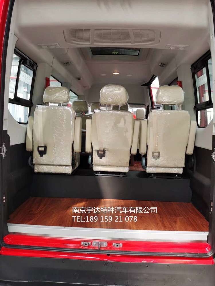 该车装备存放指挥仪器、卷线盘等设备的装备柜,主要用于指挥人员现场工作。车顶可同时或部分装备工作平台及后爬梯、换气扇、喇叭、LED显示屏、顶部空调及高杆照明灯。车身两侧可选装上掀门。