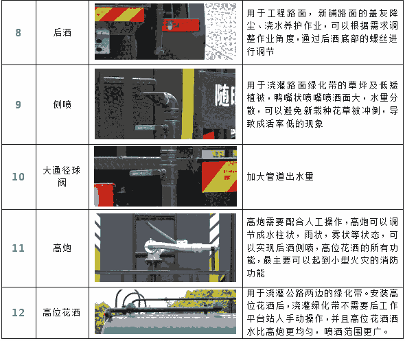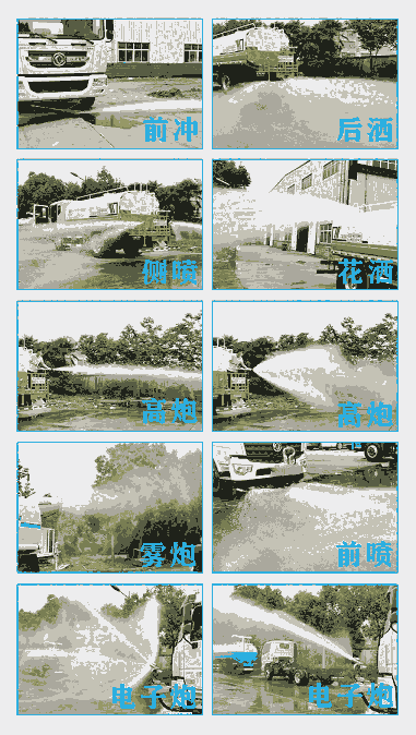 洒水宽度12米,射程28米。多功能洒水车配备2个前冲(喷)(能将路面泥巴、尘土、垃圾冲干净);2个后洒(能均匀地将水洒在路面,一次洒水宽度12米)