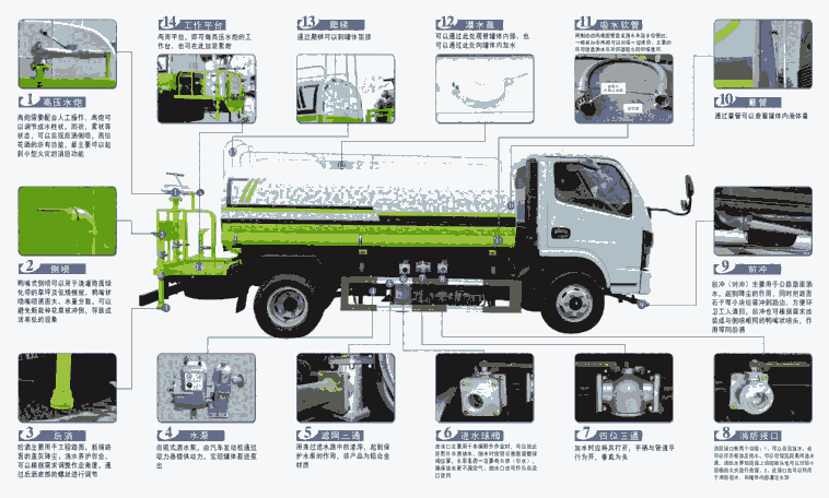 、2个侧喷(花洒)(能均匀地将路旁绿化带浇灌)、带1个后工作平台,平台上安装1个绿化洒水高炮(洒水炮可全方位旋转,可连续调成直冲状、大雨、