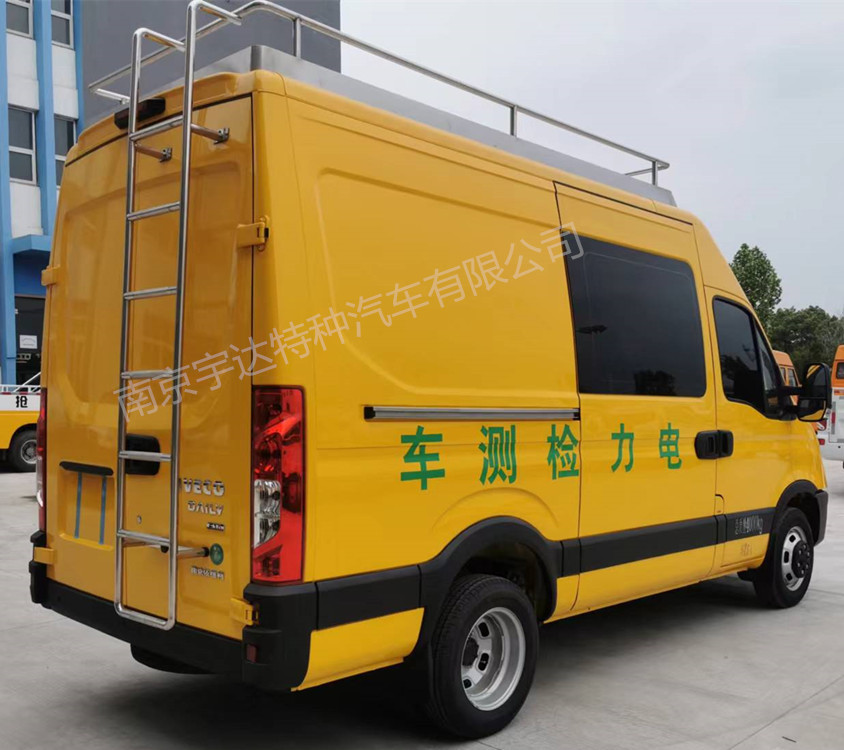 装备有检测设备柜,手提式灭火器,移动式电源绕线盘等专用设备,用于移动检测。选装便携式气体检测仪、液晶显示屏、手动门、前手动门三级踏步、上掀门、上掀窗、侧置发电机、顶部折叠显示屏,电源柜、工作平台、换气扇、LED显示屏、喇叭、顶部空调及高杆照明灯,选装盲窗。顶部无选装时整车高度:板簧悬架2726mm,复合悬架2650mm。选装工作平台、换气扇、喇叭、LED显示屏时,整车高度:板簧悬架2876mm,复合悬架2800mm。选装顶部空调及高杆照明灯时,整车高度:板簧悬架3026mm ,复合悬架2950mm。选装顶部空调及高杆照明灯时,整备质量2780kg;选装侧置发电机,顶部折叠显示屏,电源柜时,整备质量3530kg。ABS系统生产企业/型号:博世汽车部件(苏州)有限公司/ESP9。F1CE8481K发动机最大净功率123kW,F1AE8481G发动机最大净功率105kW。选装铝合金车轮,选装铝合金车轮时整车宽度为2060mm,后轮距为1558mm。选装满天星镀铬格栅、红色格栅、镀铬格栅。选装采用直接供电方式的ETC车载装置。该车配备汽车事件数据记录系统(EDR)。选装侧面盲窗外观。
