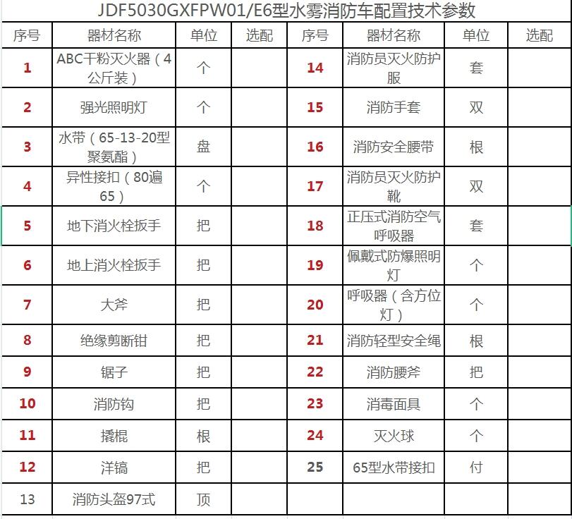 江特牌JDF5030GXFPW01/E6型水雾消防车 主要技术参数