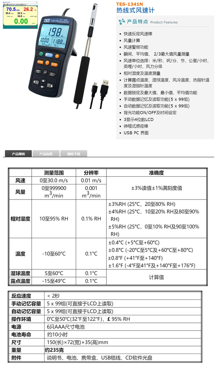 中炫供应 泰仕TES热敏风速仪TES-1340/TES-1341N 风速表测风仪厂家 品牌 | 台湾泰仕TES | ||