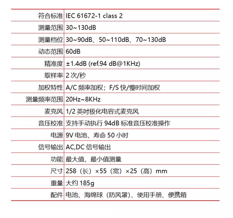 准确性 | ±1.5dB (在参考音压94dB @1KHz) | ||