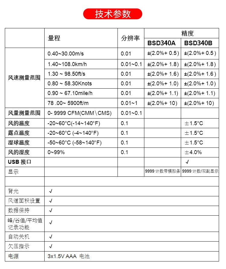 BSD-340A/340B叶轮式风速风温风量仪贝斯顿BASDEN手持式气象仪 是否支持加工定制 | 否 | ||
