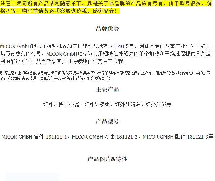 型号 | MICOR GMBH 备件 181121-1、MICOR GMBH 灯座 181121-2、MICOR GMBH 配件 181121-3 |