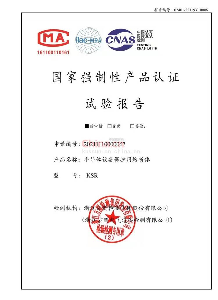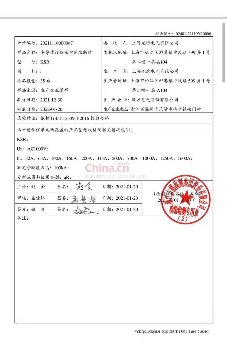 快速熔断器经中国质量检测中心 的低压电器试验站进行了型式试验,全部试验项目合格。