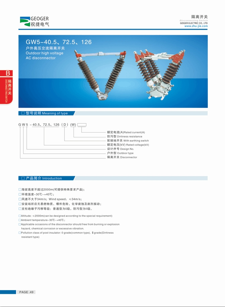 户外66KVV型交流隔离开关GW5-66DW/1250-31.5祝捷电气