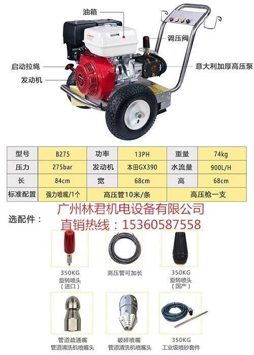君道B275汽油高压清洗机,本田汽油发动机驱动,工作压力可调,zui大压力可达275公斤,使用寿命超长,本产品适合缺乏电源的地方工作,主要用于军队、港口、公路收费站、市政环卫的整治清理等。