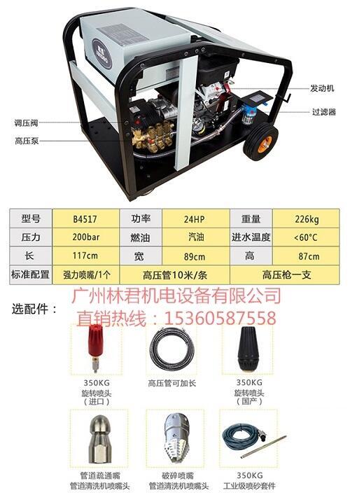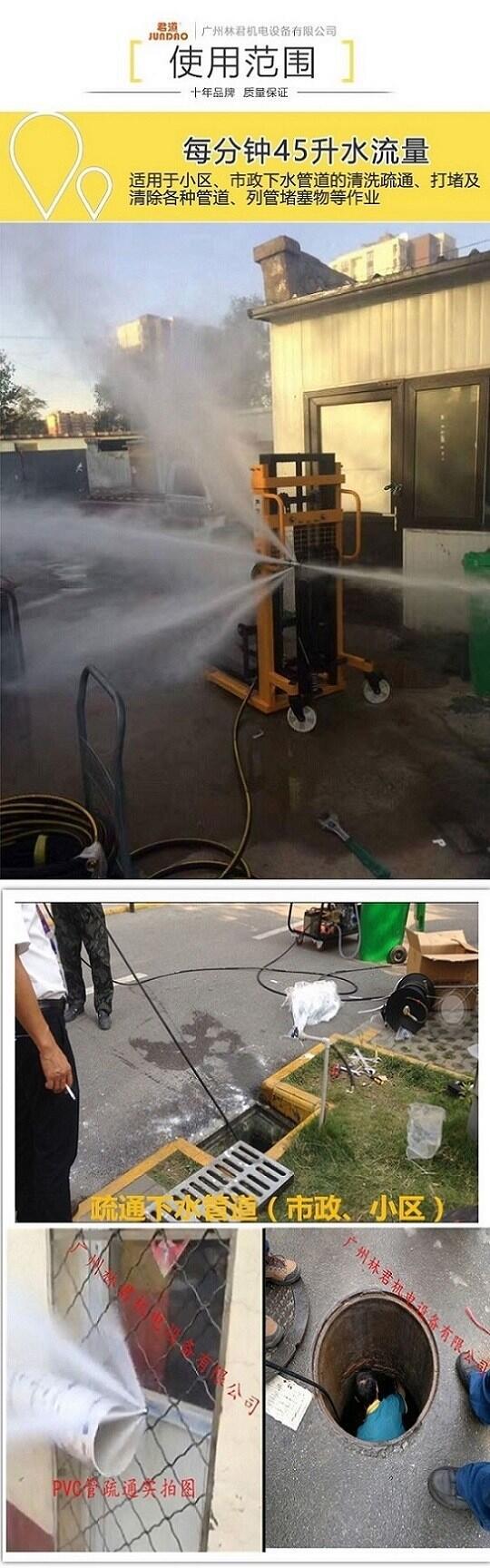 高压清洗机有电机启动的,有燃油启动的,燃油启动的适合在野外没有电源的地方工作。其中,君道B4517管道清洗机是汽油发动机驱动。使用汽油噪音小,且挥发性快。本产品适合缺乏电源的地方工作,具有优异性能的高压机动性自驱机型,装置24匹功率发动机,200公斤的高压力配合45升每分钟的水流量,能够在恶劣的操作环境下非常有效的去除顽垢。其坚固型的管状钢架结构可以充分保护部件,紧凑型坚固的机身,适合放置于车上,移动方便,方便户外清洁。主要用于公路护栏、港口、公路收费站、市政环卫的整治清洗等。