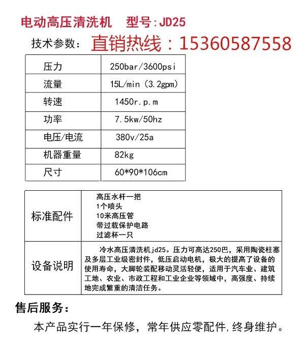 冷水高压清洗机JD25,压力可高达250公斤,采用陶瓷柱塞及多层工业级密封件,低压气动电机,极大的提高了设备的使用寿命,大脚轮装配灵活轻便,多用于汽车业、建筑工业、农业、市政工程和工业企业等领域中,高强度、持续的完成繁重的清洁任务。