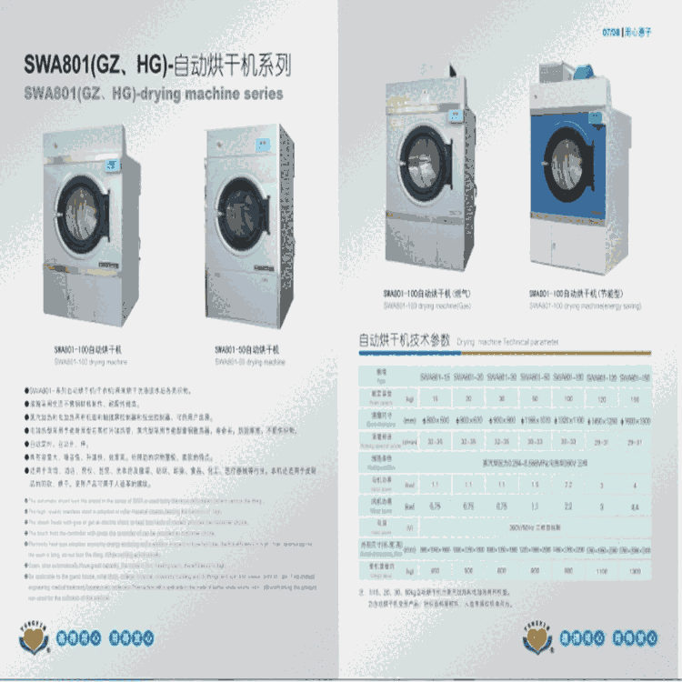 三、宾馆蒸汽消毒洗衣机结构特点、1)本机转筒采用优质不锈钢板经冲压加工氩弧焊接而成,表面光滑,经久耐用;2)本机采用自动控制装置,只要衣物放入转筒,按织物种类调节好时间,就会自动完成整个烘干过程;3)本机送物门较大,投入或取出方便,门上装有透明钢化玻璃,随时可观察内部织物烘干过程;4)本机传动部分采用三角胶带传动,具有运转平稳、噪声低、安全可靠;5)本机系箱柜式,结构紧凑,因此占地面积小,适用于各种场地;