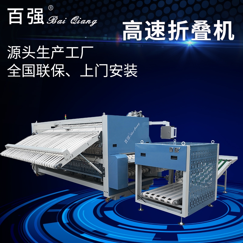 3.3米高速折叠机 酒店床单被套折叠设备 洗衣厂整理设备 百强高速折叠机1. 可以实现 2 横 +3 纵的折叠方式,2 横可以选择刀折或者气折,3 纵全部采用刀折;