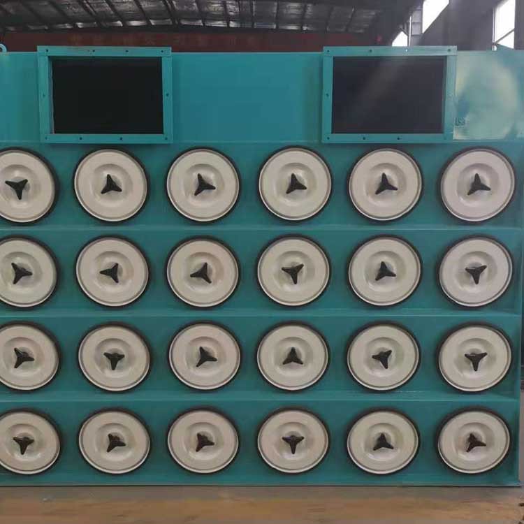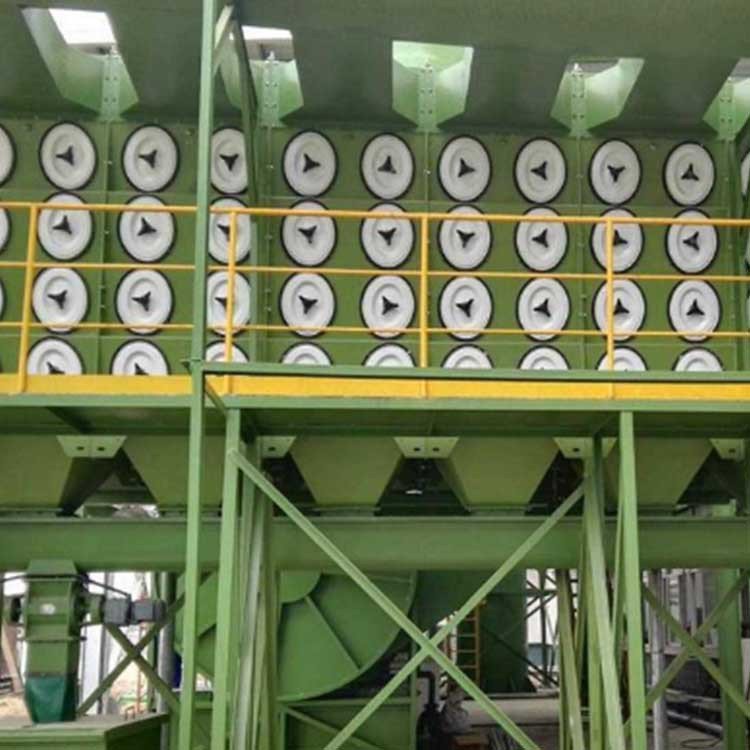 脉冲滤筒除尘器设有进风口、滤筒、出风口、气包、脉冲控 制仪、脉冲喷吹阀、喷吹管等,滤筒是由聚脂纤维折叠、卷制而成,其下端封闭,上端正对喷吹管下口。含尘气体由进风口进入滤筒除尘器后,气流速度减慢,粗颗粒脱离气流沉降到集尘室内,细微粉尘随气流穿过滤筒时被阻于滤筒外表面,洁净气体由出风口排出;当滤筒表面灰层较厚时,脉冲控 制仪发出指令开启喷吹阀,气包内的压缩空气经喷吹管高速喷出,同时诱导数倍于喷射气量的周围空气进入滤筒,并由内向外快速射出,将滤筒外表面的粉尘吹下落 入集尘室内,最后由放灰斗排出。