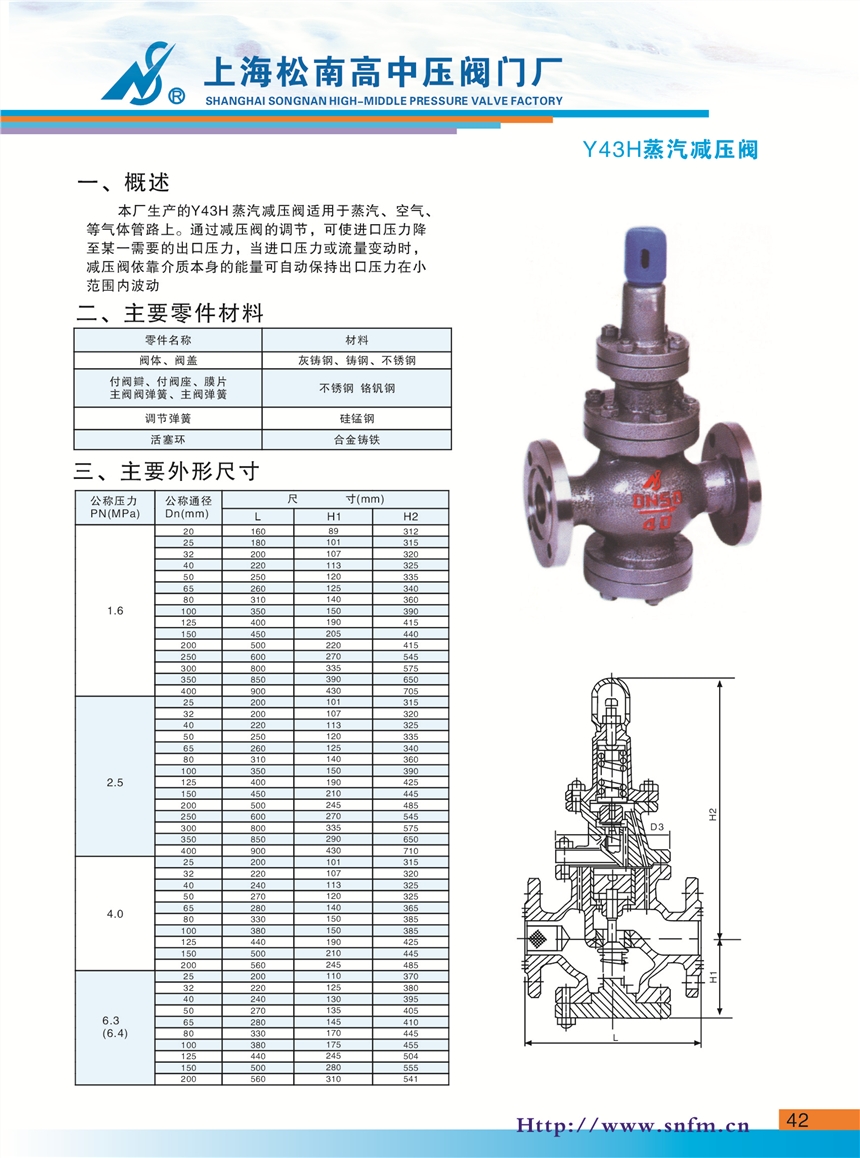 Y43H系列蒸汽减压阀适用公称压力PN1.6,2.5,4.0,6.3MPA。工作温度t<300,350,400,425°C的蒸汽管道上。本阀通过启闭件的节流,将使进口压力降至某一需要的出口压力,并借助介质本身能量使阀后压力自动满足预定要求。但此阀的进口压力与出口压力之差必须>0.15mpa,进口压力在1.0mpa以上的出口压力调节范围应在进口压力的80%。本阀主要特点:调节灵敏,流量特性与压力特性偏差值小,动态工况稳定,阀内设有过滤装置,保证工况,延长使用寿命。