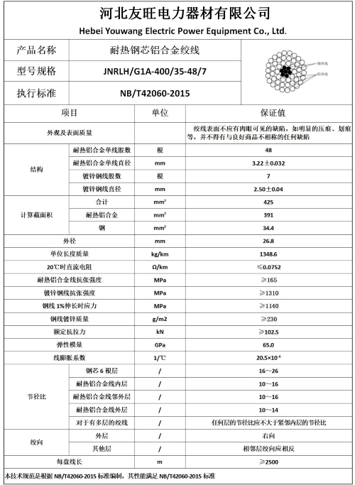 二、产品执行标准: NB/T42060-2015《钢芯耐热铝合金架空导线》