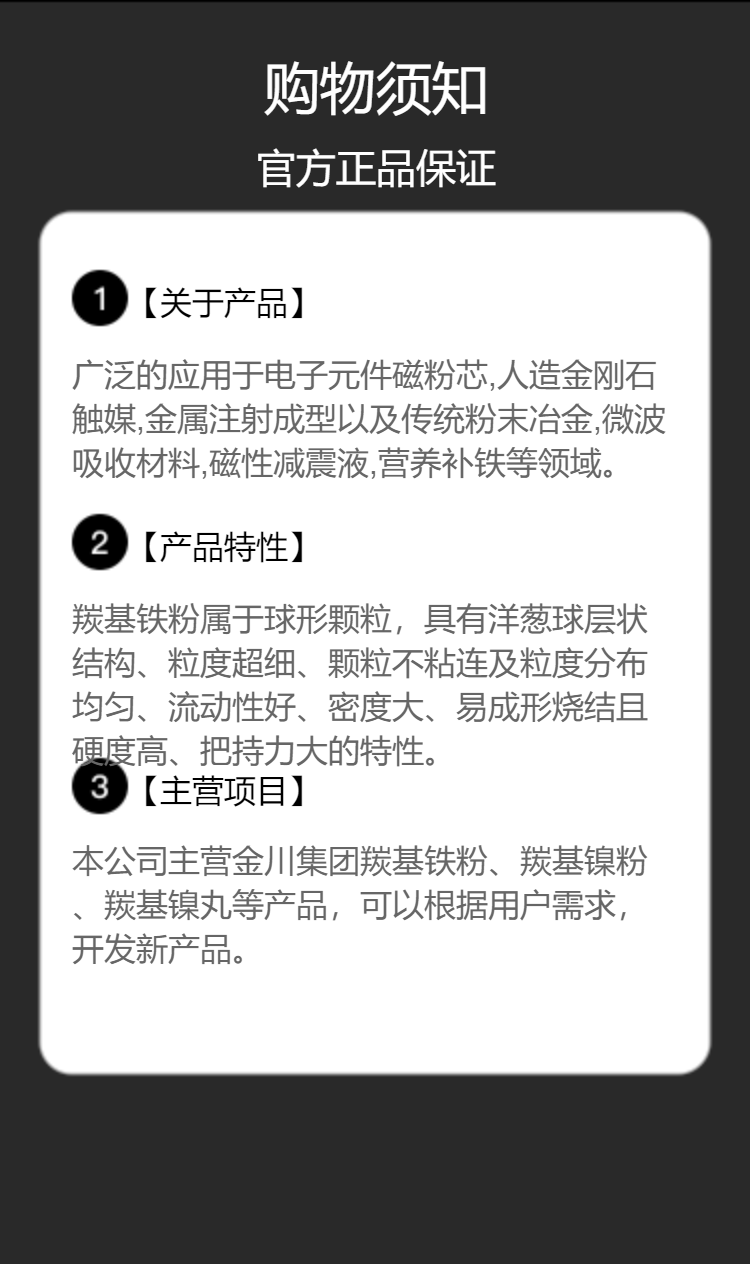 用途 | 广泛的应用于电子元件磁粉芯 | ||