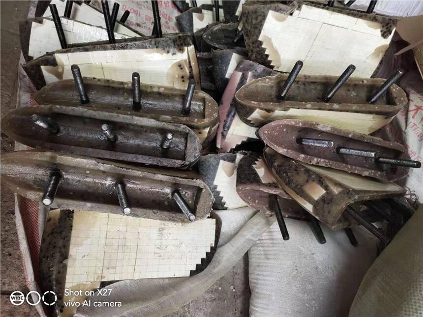 【耐磨搅刀】产品特点 1、耐磨性能好,使用寿命长。由于搅刀工作表面复合陶瓷层硬度HRA≥86,其耐颗粒冲刷磨损性能至少是普通碳化钨堆焊、喷涂喷焊以及合金粉块堆焊等搅刀的5倍以上,是普通搅叶(铁板搅叶)、铸铁搅叶的30倍以上,是铺焊铁铬硼寿命的5—8倍。通俗地讲,使用该产品,粘土原料可产砖坯约3000-4000万左右;页岩、煤矸石原料可产砖坯2000-3000万左右。 2、安全可靠效率高。由于采用了各种高技术复合陶瓷技术,而且复合层韧性极佳,没有一次因陶瓷脱落或非正常磨损而导致搅拌机非计划停运的事故,经受住了长时间及大批量的考验,由此大大提高了搅拌机的运行效率、搅拌均匀性和搅拌量,降低能耗和维修安装时间,有效提高了经济效益。 3、节约成本。为厂家降低制造成本30%以上,为用户节约至少5万元/年。 4、结构简单,安装维修方便。该产品独特的结构设计使其安装简单方便,一次成型高分子陶瓷叶片维修简单易行甚至无需检修,特别适于水泥、冶金、建材等行业搅拌粉末状物料的单、双轴搅拌机上装用。