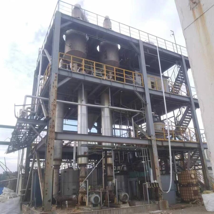二手蒸发器主要分为降膜蒸发器;升膜蒸发器;强制循环蒸发器;浓缩蒸发器等。降膜蒸发是将料液自降膜蒸发器加热室上管箱加入,经液体分布及成膜装置,均匀分配到各换热管内,在重力和真空诱导及气流作用下,成均匀膜状自上而下流动。流动过程中,被壳程加热介质加热汽化,产生的蒸汽与液相共同进入蒸发器的分离室,汽液经充分分离,蒸汽进入冷凝器冷凝(单效操作)或进入下一效蒸发器作为加热介质,从而实现多效操作,液相则由分离室排出。设备主体由Ⅰ、Ⅱ、Ⅲ效加热器、分离器、热压泵、冷凝器、杀菌器、保温管、料泵、水泵及仪表柜组成。