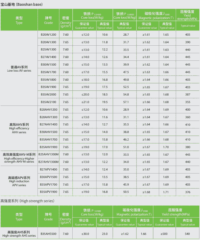宝山基地新能源汽车驱动电机用硅钢B20AV1200 B20AV1300 B25AV1300 B27AV1400 B30AV1500 B35AV1700 B35AV1900 B35AV2000 B35AV2100 B20AHV1200 B20AHV1300 B27AHV1400 B30AHV1500 B35AHV1700 B35AHV1900 B25AHV1300M B27AHV1300M B27APV1400 B30APV1500 B35APV1700 B35APV1900 B35AHS500等牌号。?