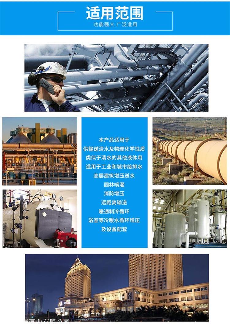 8、卧式离心泵适用于空调、采暖、卫生用水、水处理冷却冷冻系统、液体循环和供水、增压及灌溉等领域中无腐蚀的冷水和热水输送。