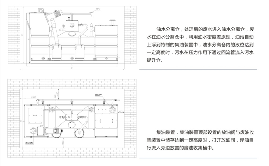 设备安装于地面以下,餐饮废水通过自流到设备内,隔油提升设备通过油水分离技术,把油脂分离收集起来,把污水提升到地面管网;该设备油水分离精度高、环保性能好,一体化结构,无需新建隔油池,结构紧凑,占地面积小,节省投资,不锈钢一体,干净卫生,自动化运行,便于日常管理。