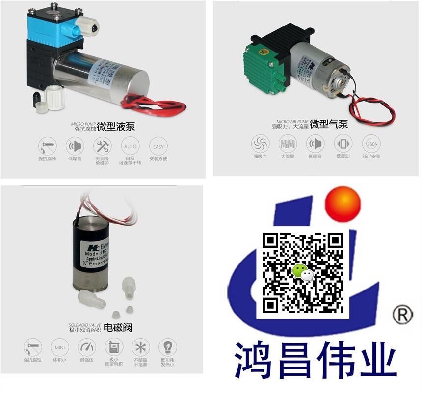 深圳市鸿昌伟业电子科技有限公司是生产微型隔膜泵和微型电磁阀的厂家。简称“HC”,位于广东省,被称为鹏城的城市,深圳市宝安区沙井镇南环路华丰高新产业园D座3楼。目前公司主要产品:微型真空泵,微型气泵,微型隔膜泵,微型采样泵,微型抽气泵,美容仪器气泵,微型医疗泵,微型电磁阀,喷码机压力泵及真空泵,光伏行业无刷水膜泵,采样泵,VOCs高温泵,陶瓷喷墨机专用泵,微型溶剂泵,打印机墨泵,微型气泵,微型水泵,隔膜液泵,微型采样泵,气体循环泵,COD电磁阀,美容气泵,阀,生化泵、采样泵、冲洗泵、废液泵、排液泵、加液泵、输液泵、回收泵、各种过滤器、微型电磁阀等产品。产品广泛用于气体采样,仪器仪表,生物化工,美容仪器,医疗保自动控制,环保分析,水处理,实验室分析检测仪器等众多领域。