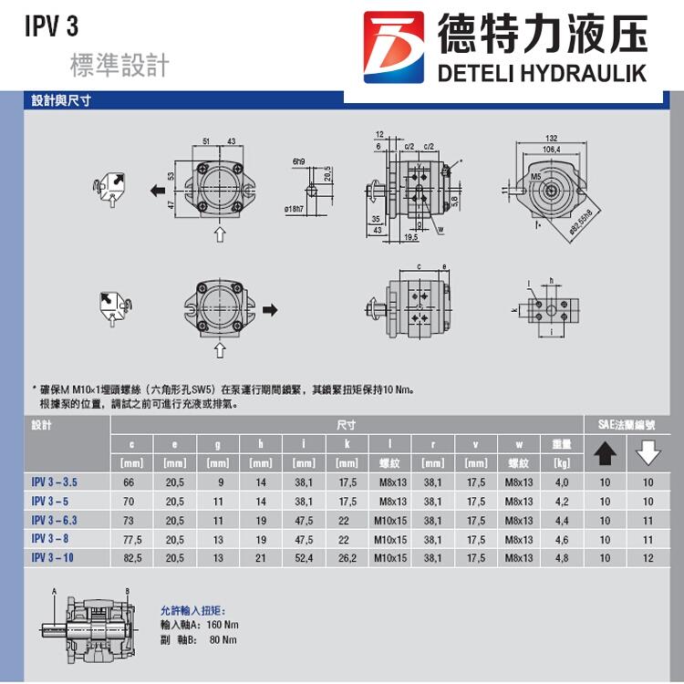 福伊特IPV3-6.3-101每转排量6.4ml,采用两孔法兰安装,圆轴平键,油口为法兰式连接。连续工作压力330bar,峰值压力可达到345bar,低转速400转/分,高转速可达3600转/分。