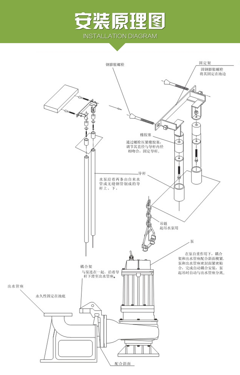潜水排污泵能抽含有碎布、短纤维材料及一般废物和其它一些未处理的污水,并能通过直径不大于出口直径50%的固体颗粒;