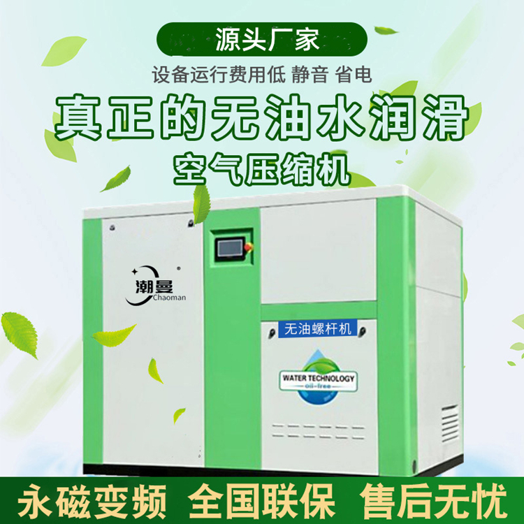 无油水润滑螺杆压缩机是单螺杆设计,顾名思义单螺杆压缩机只有一根螺杆,其螺杆同时与两个或两个以上的星轮啮合。螺杆型面、星轮端面、螺杆两端盖板共同围成若干封闭容积,实现气体的压缩。压缩主机采用不锈钢材质,通过纯净水来实现压缩机的润滑和散热,空气压缩的全过程完全没有油的参与,所以可以实现真正的纯无油。