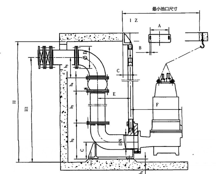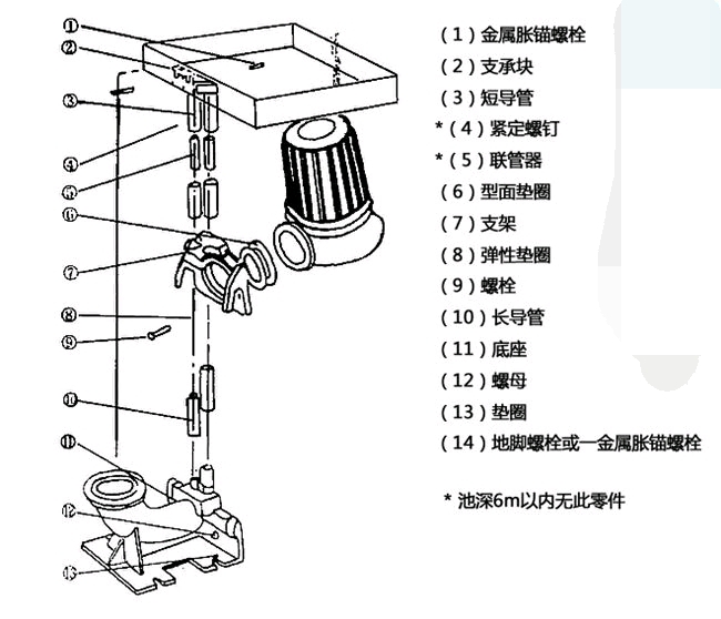 (1)固定湿式安装:采用自动耦合系统,水泵沿导轨下滑到底座,与其进水口自动耦合并密封可靠(详见自动耦合装置安装说明书)。