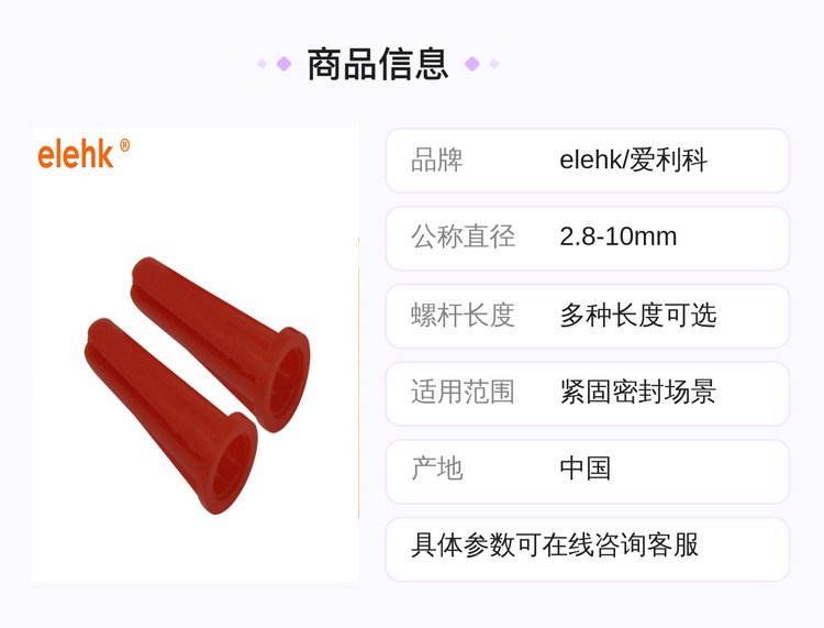 elehk/爱利科塑料圆形膨胀管入墙胶塞 符合美标英标 批发配螺丝 品牌 | elehk/爱利科 | ||