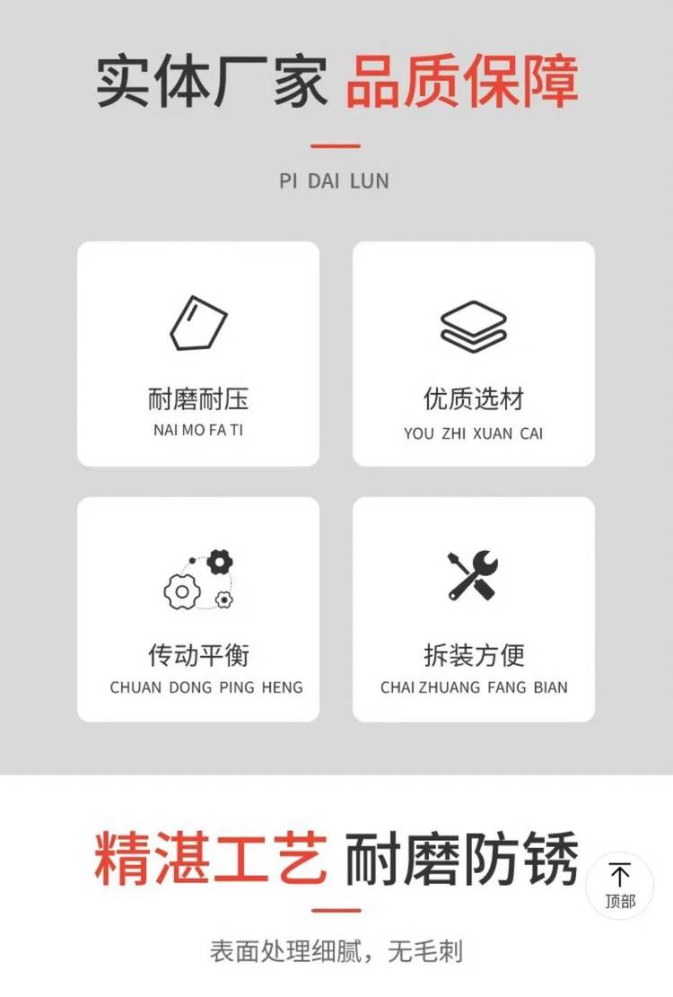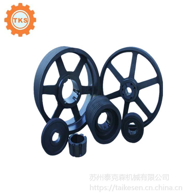 ???????苏州泰克森机械有限公司生产的皮带轮采用HT250铸铁材质,质量分布均匀,消除制造中产生的内应力,皮带轮应进行静平衡校正。具有良好的铸造性能、良好的减振性能、良好的耐磨性能、良好的切削加工性能等特点。完全没有沙眼;特点:具有稳定性强,做过动平衡,无噪声,不生锈,发黑处理,不损伤皮带.耐磨,使用寿命长.与锥套配合使用,拆装十分方便,有单槽,双槽,3槽,4槽,5槽 10槽等等。批量生产,大量库存,另外为了方便新老客户的购物需求,同步带轮和齿轮也可以定做,价格便宜,货期短,发货及时。所有产品均采用真空包装,安全,美观,大气!价格优惠,欢迎订购!