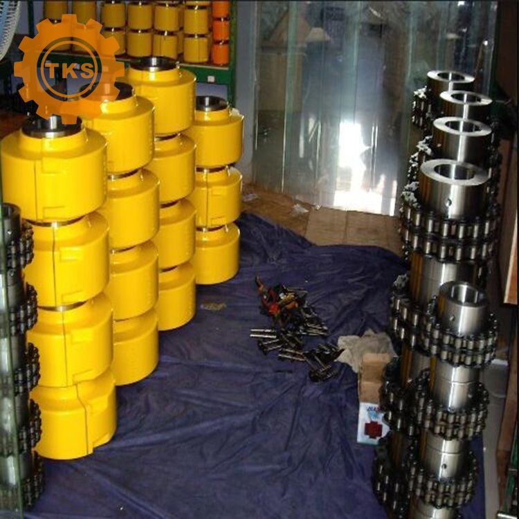 链条联轴器利用公用的链条,同时与两个齿数相同的并列链轮啮合,不同结构形式的链条联轴器主要区别是采用不同的链条,常见的有双排滚子链联轴器,单排滚子链联轴器,齿形链联轴器,尼龙链联轴器等。双排滚子链联轴器的性能优于其他结构形式的联轴器,他具有结构简单,装拆方便,拆卸时不用移动被联接的两轴,尺寸紧凑,质量轻,有一定补偿能力,对安装精度要求不高,工作可靠,寿命较长,成本较低等优点。主要型号有:GL型(不带罩壳)、GLF型(带罩壳)