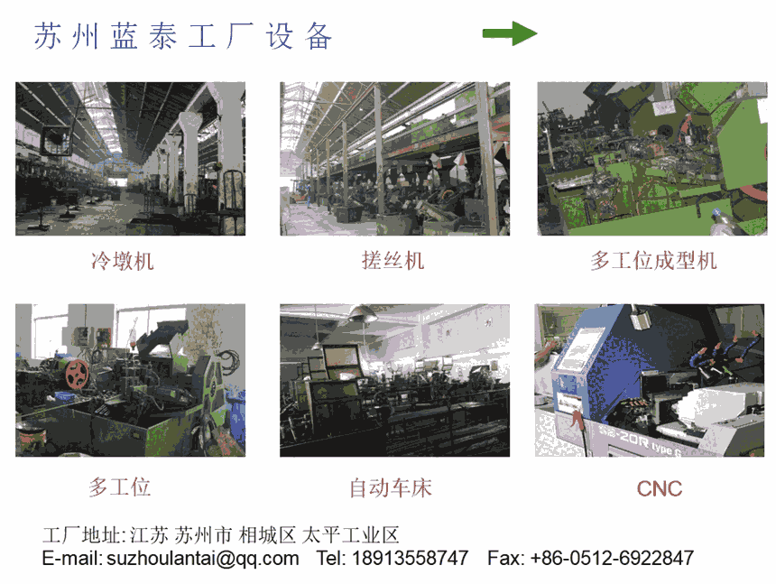 苏州蓝泰五金制品有限公司挂牌成立于2001年,拥有最先进的台湾多工位成型冷镦机设备15台。月产量近亿,客户遍布全球。主打产品:不锈钢半空心铆钉,铁铆钉,铝铆钉,铜铆钉,台阶铆钉,异形铆钉,非标螺丝,不锈钢螺丝,防盗螺丝,钻尾螺丝均是一次成型,无需二次加工。成本低,没有中间环节。质量做第一,服务做第一,价格做最低以满足客户的需求。小螺丝,大世界,一流的螺丝配套一流的企业。给客户解决紧固连链接问题