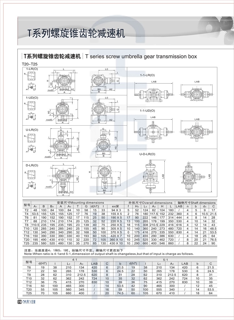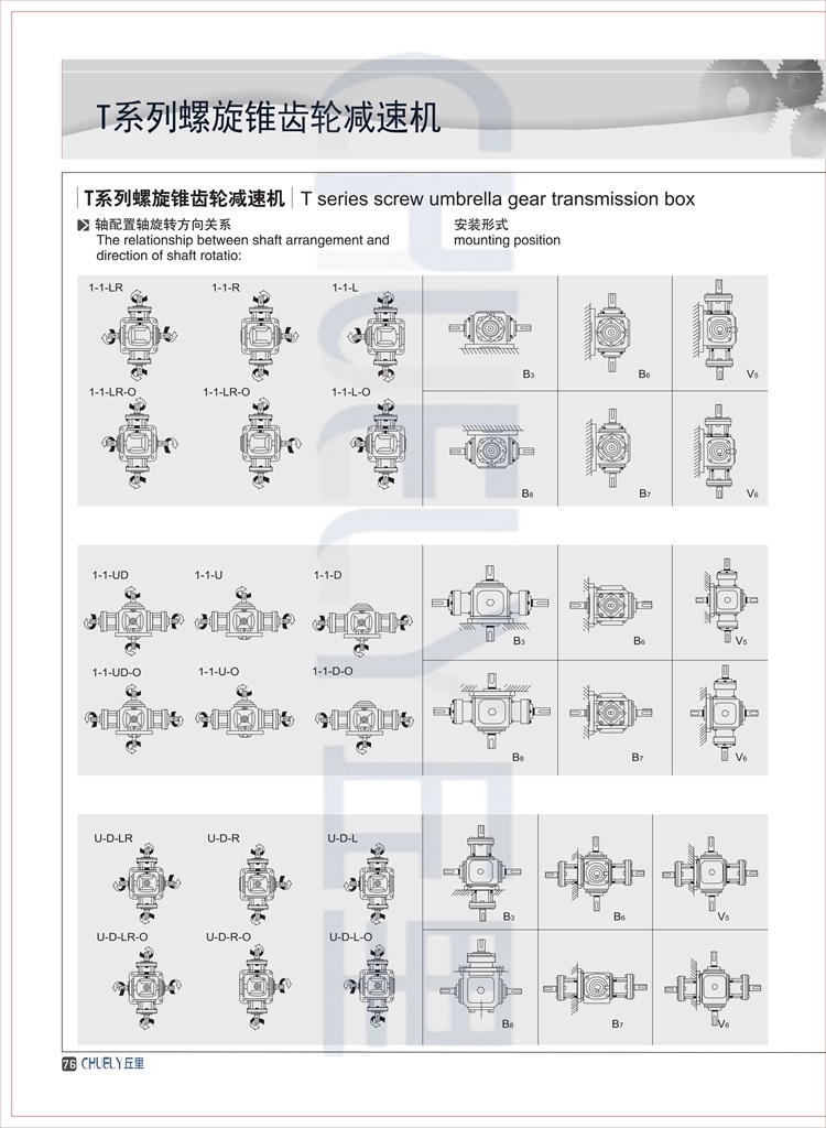 1、T系列螺旋伞齿轮转向箱,标准化,多品种, 速比全部为实际传动比。平均效率达98% 。