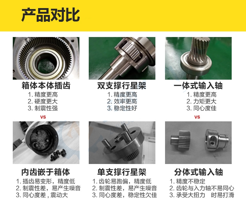 减速机齿圈、行星架、输入轴均采用40Cr结构钢,经热锻加工工艺,从而获得更高的材料密度,比采用锻造箱体、圆钢等,具有更高强度刚性、韧性。